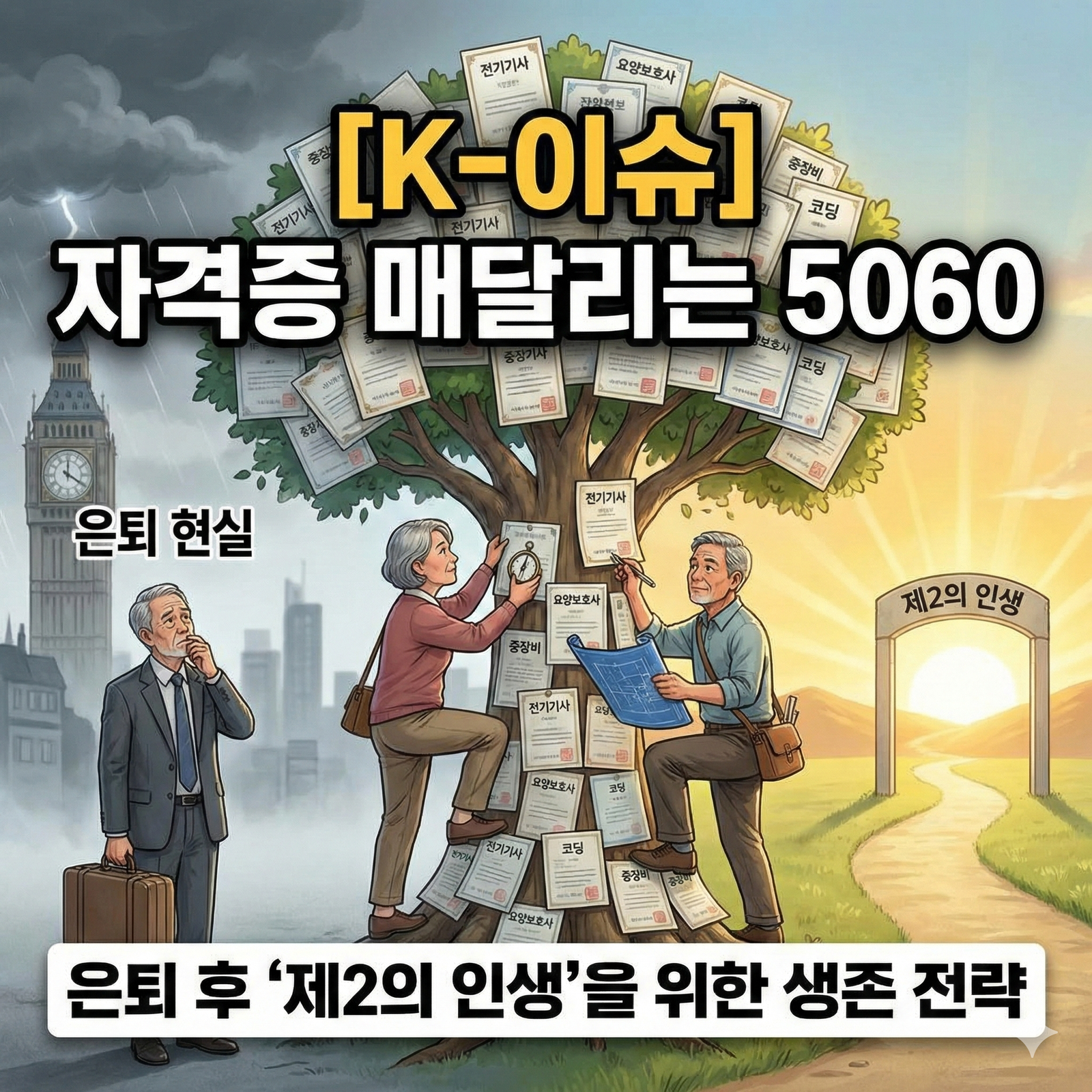 - 5060 세대의 자격증 열풍은 단순한 자기계발을 넘어, 정년퇴직 후 재취업이나 창업을 통해 경제적 독립을 유지하려는 **’실질적 생존 전략’**으로 자리 잡았습니다.
