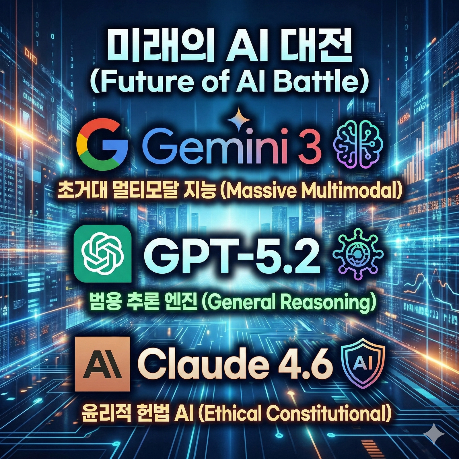 핵심 요약 상세 가이드: 주요 AI 모델별 핵심 사양 및 강점 비교 비교 항목 Gemini 3 Pro (Google) ChatGPT 5.2 (OpenAI) Claude 4.6 Opus (Anthropic) 핵심 강점 멀티모달(영상/음성) 분석 및 속도 논리적 추론 및 수학적 정밀도 코딩 무결성 및 자연스러운 문체 컨텍스트 창 최대 1M~2M 토큰 (압도적) 200K~512K 토큰 200K (안정성 특화) 추론 능력 빠르고 … 더 읽기