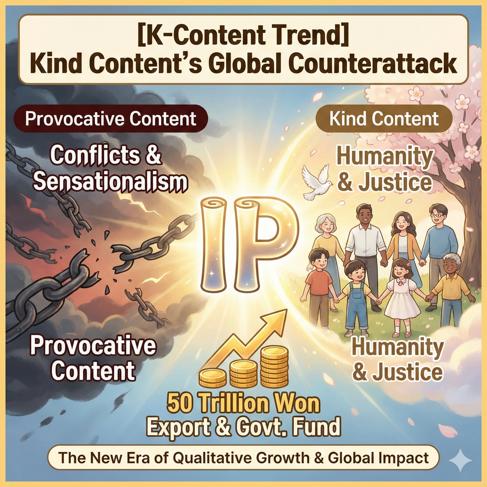 ‘Kind Content’ featuring humanity and justice is reshaping the global market. We analyze the secrets behind the qualitative growth of K-content, which has opened the era of 50 trillion won in annual exports along with 300 trillion won in government investment.